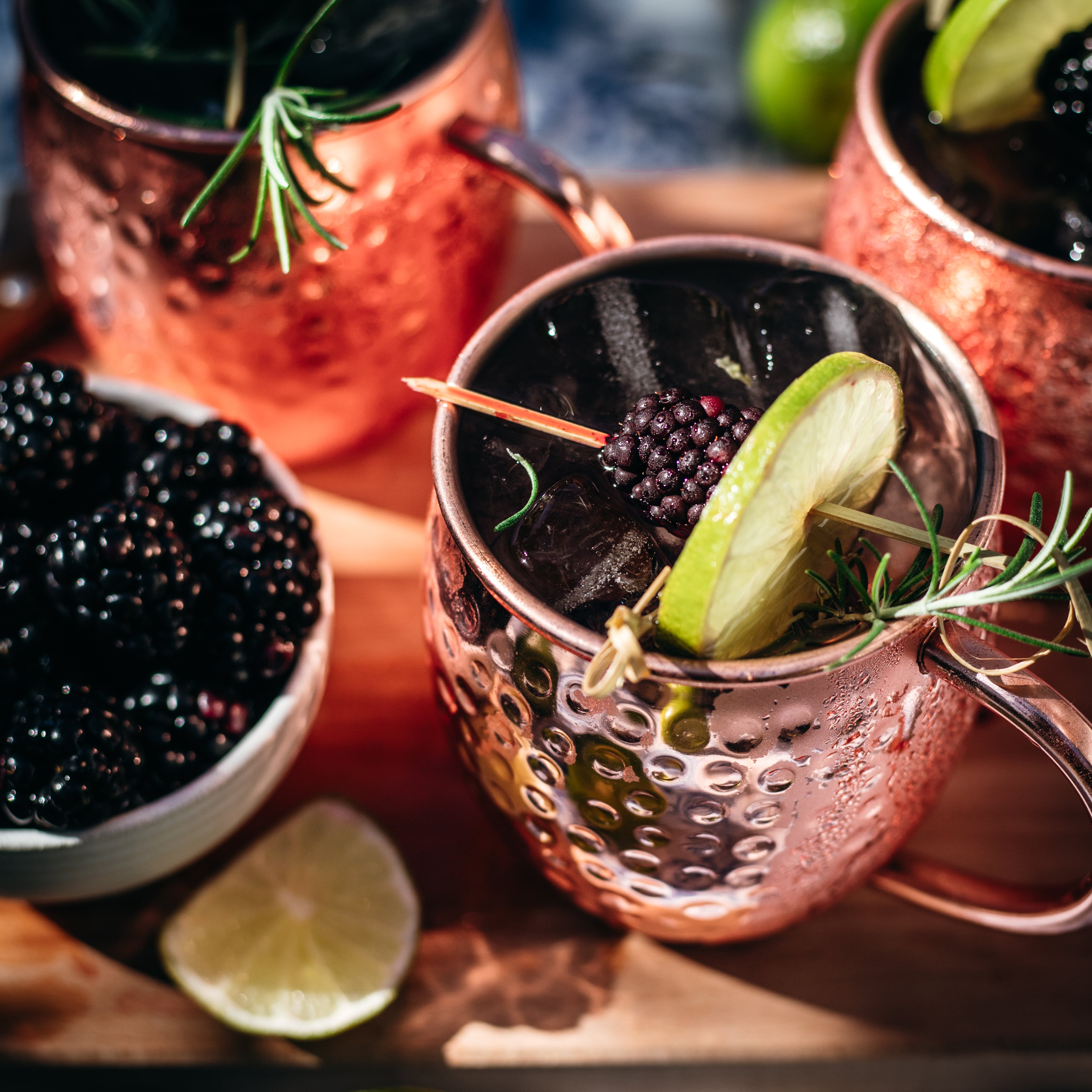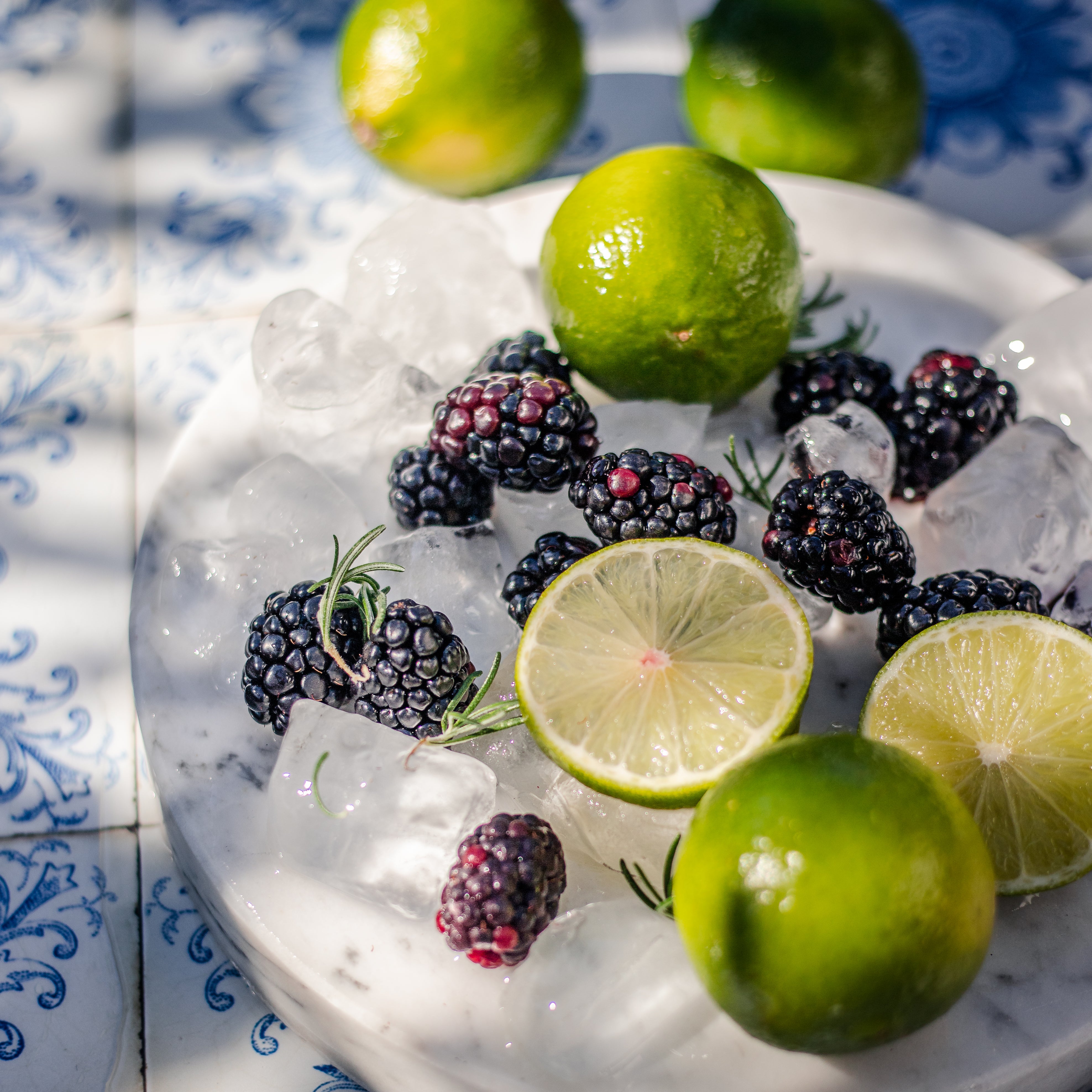 Decorate with a few whole blackberries, a sprig of rosemary and slice of lime.