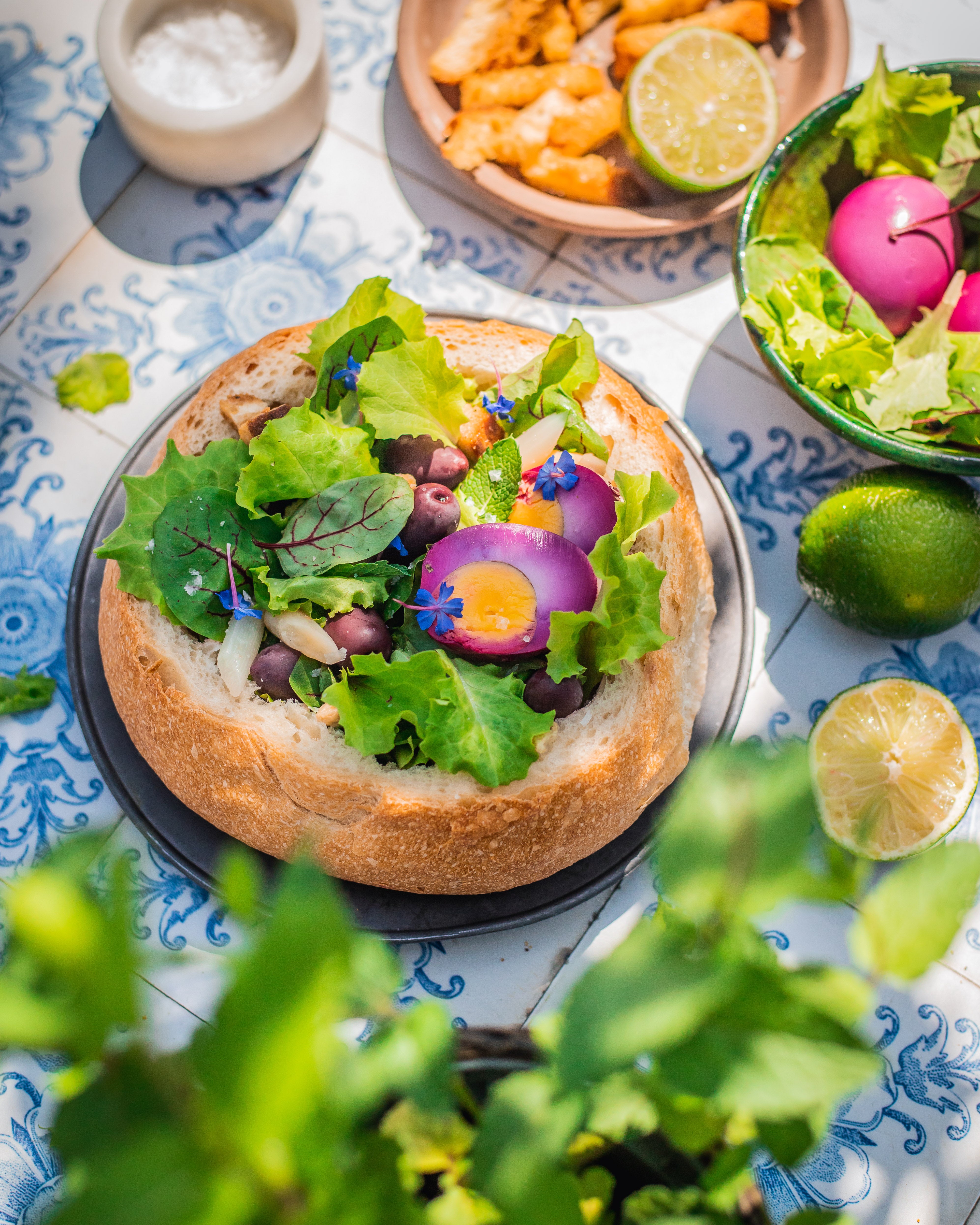 Place this mixed salad inside the hollowed-out loaf. Top with the pink eggs cut in half and the white asparagus cut into chunks.