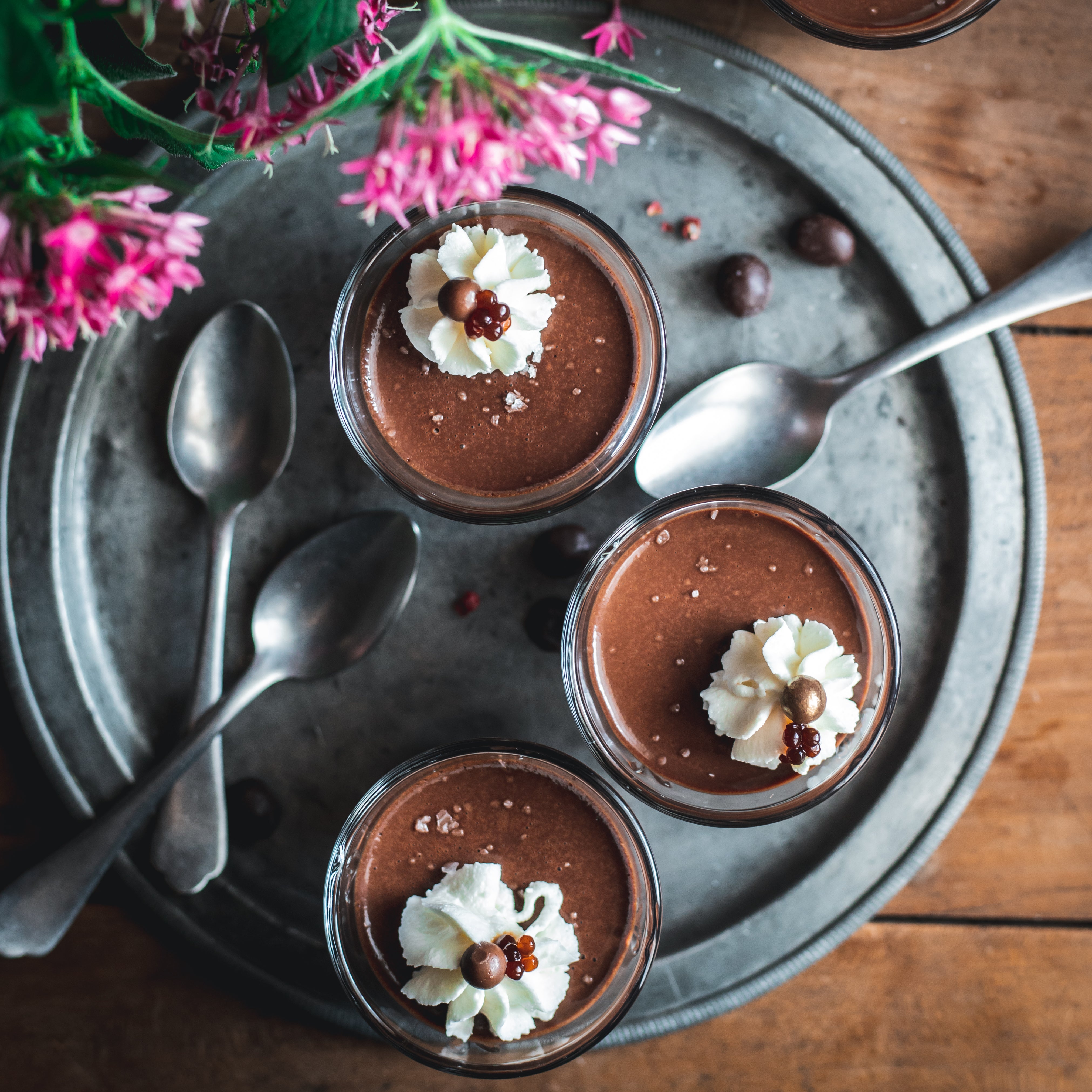 Top each dish with a generous dollop and then decorate with Balsamic Vinegar Pearls, dark chocolate pearls and a few more flakes of salt.