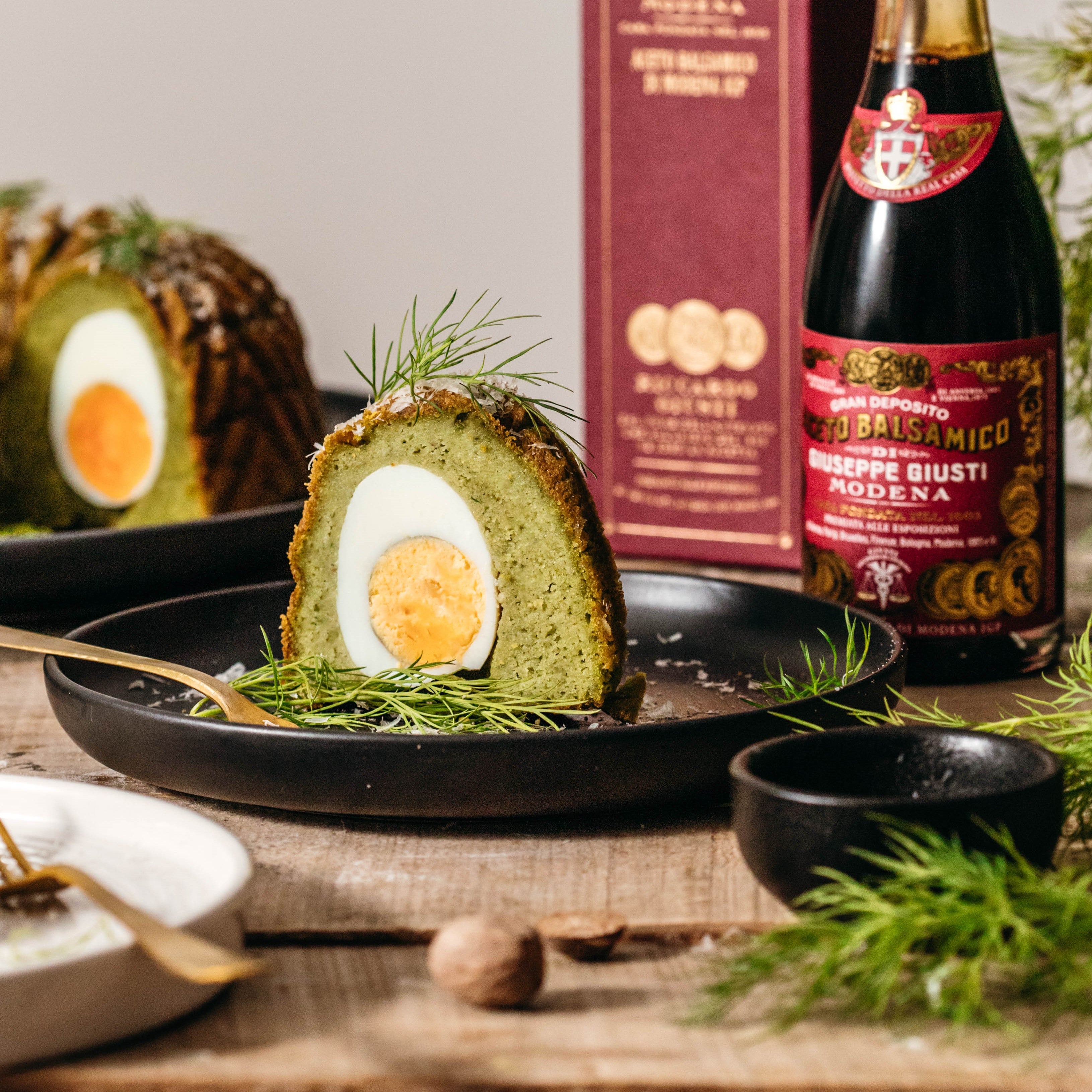 Savoury ring-shaped cake with wild herbs, Ricotta cheese, and boiled e