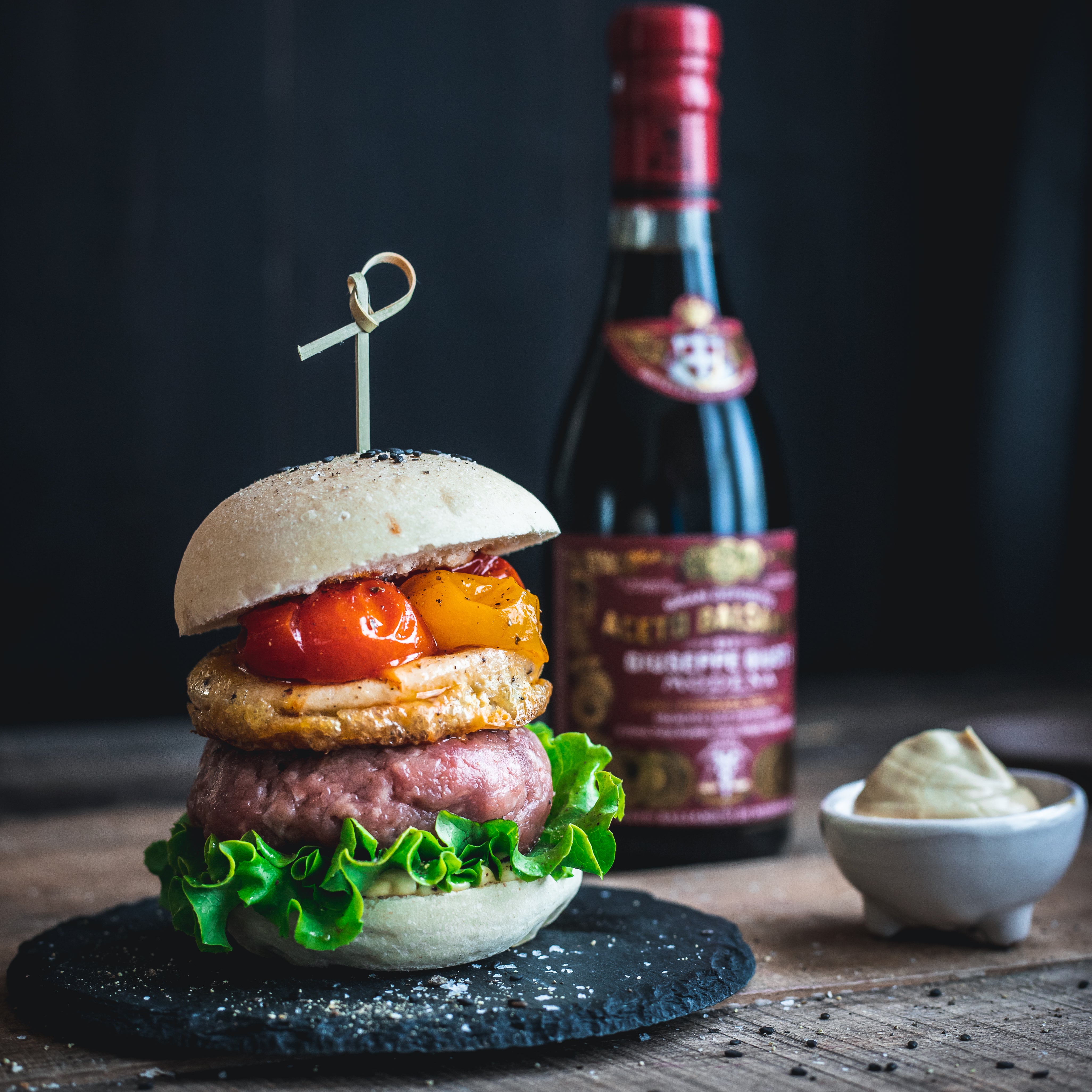 Die Mini-Burger zusammensetzen. Dazu eine dünne Schicht Balsamico-Mayonnaise auf das Unterteil des Brötchens streichen.