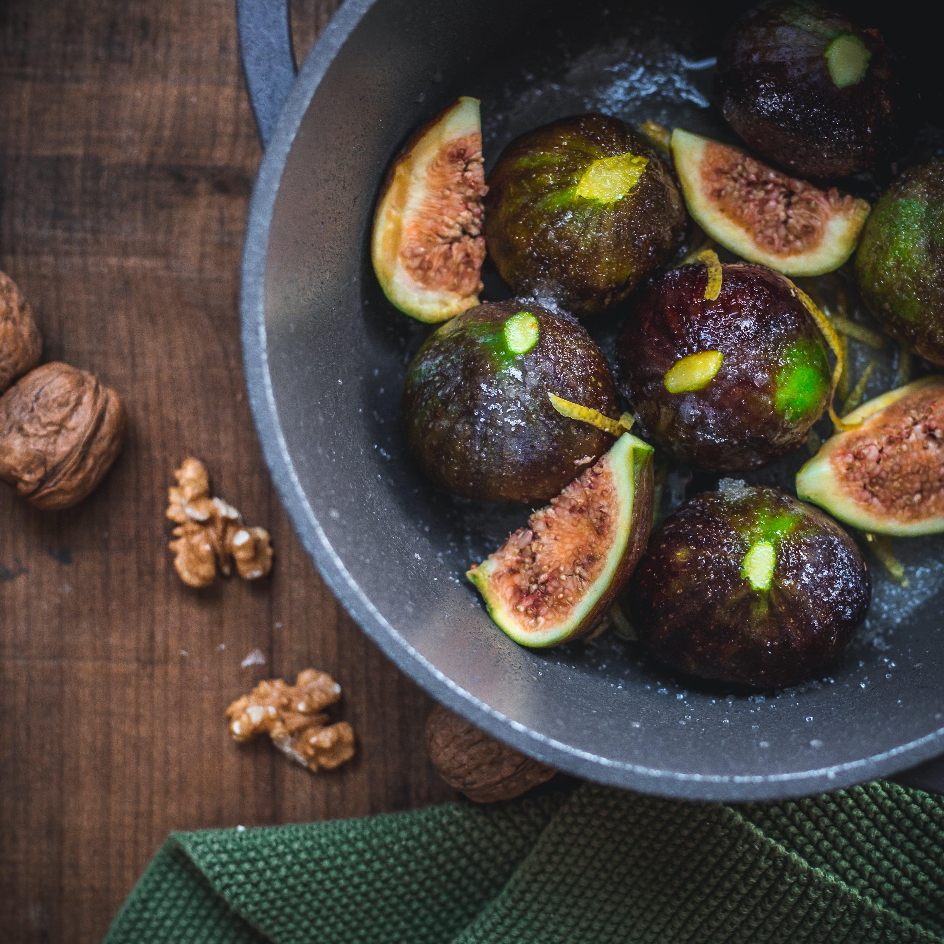 Wenn der Sirup eingekocht ist und die Feigen gut karamellisiert sind, 1 Silbermedaille Balsamessig und die grob gehackten Walnüsse hinzufügen.