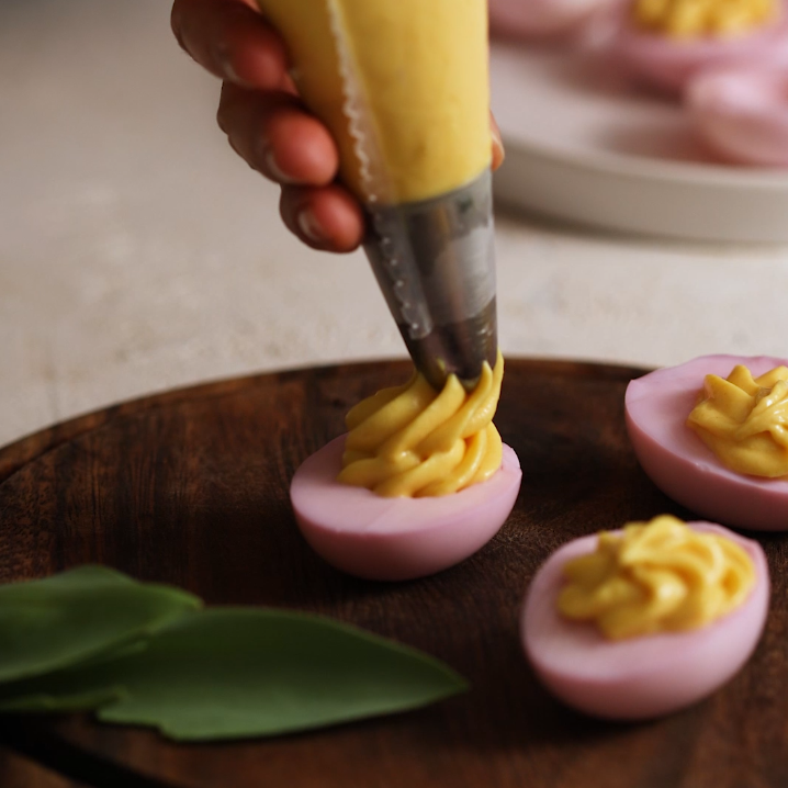 Alle potenziellen Membranen von den Eiweißen entfernen. In einer großen Schüssel 300 ml Wasser mit 300 ml Rote-Bete-Saft mischen (alternativ kann man auch Lebensmittelfarbe verwenden). Die Eiweiße eintauchen und genau überwachen; sobald sie eine rosa Farbe angenommen haben (das dauert etwa 10 Minuten), mit Küchenpapier abtupfen und auf eine Servierplatte legen.