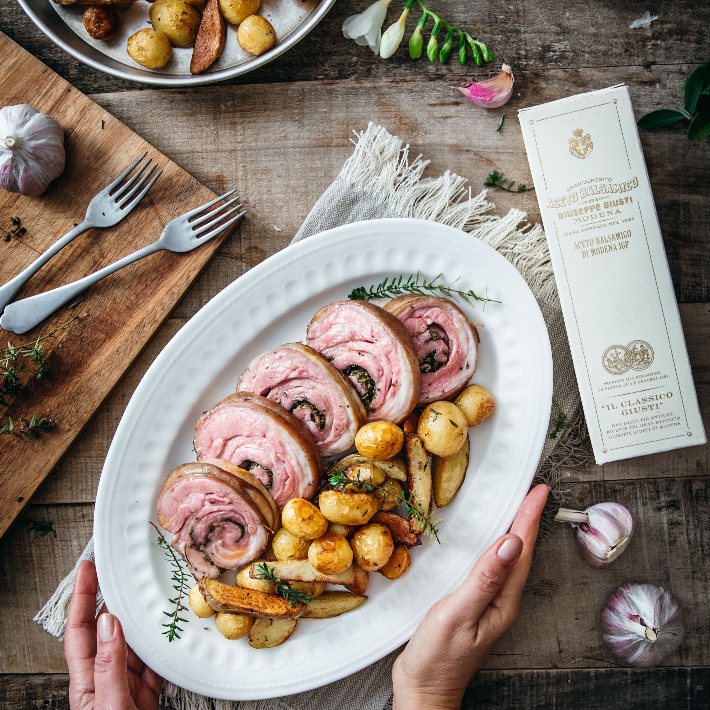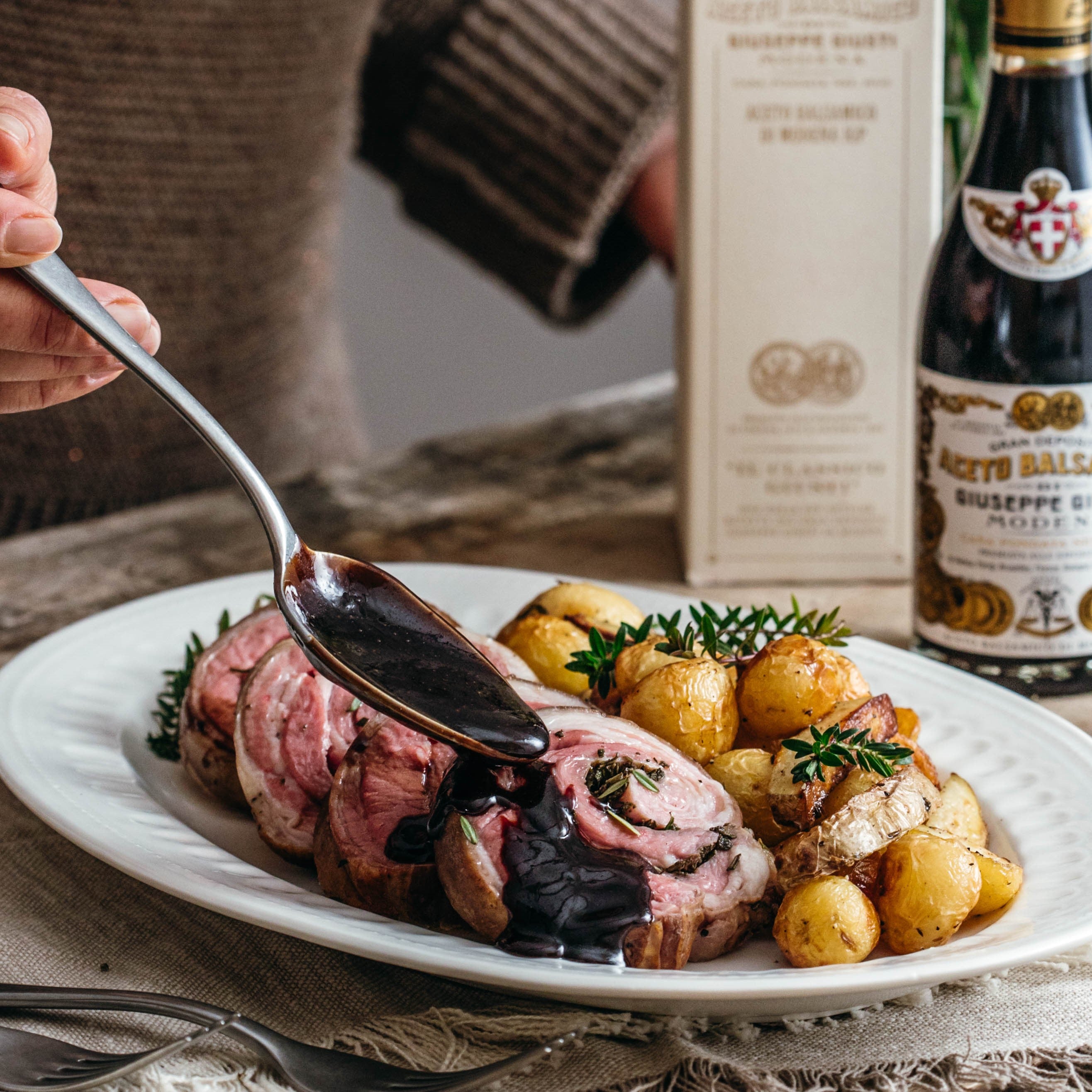 Das Lammfleisch in dicke Scheiben schneiden, etwa 2 cm dick, und auf einer Servierplatte mit den gerösteten Kartoffeln anrichten. Die Platte für etwa zehn Minuten bei 130°C in den Ofen stellen, um durchzuwärmen. Sobald aufgewärmt, die Lammstücke mit einigen Löffeln Balsamico-Sauce beträufeln und sofort servieren.