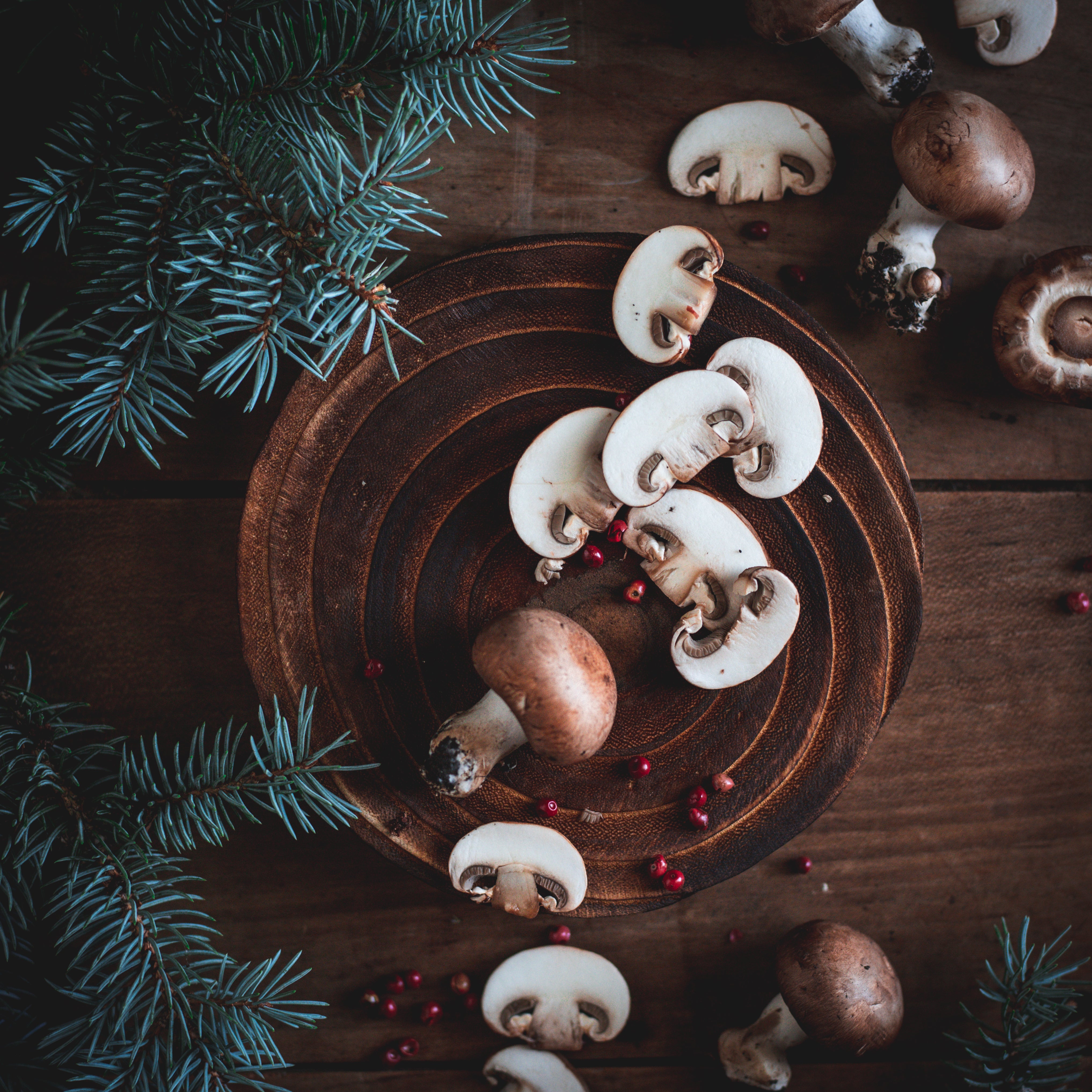 Die Pilze in einer Pfanne mit einem Esslöffel Öl und einer Knoblauchzehe anbraten. Mit Salz und Pfeffer abschmecken. Herd ausschalten und beiseite stellen.