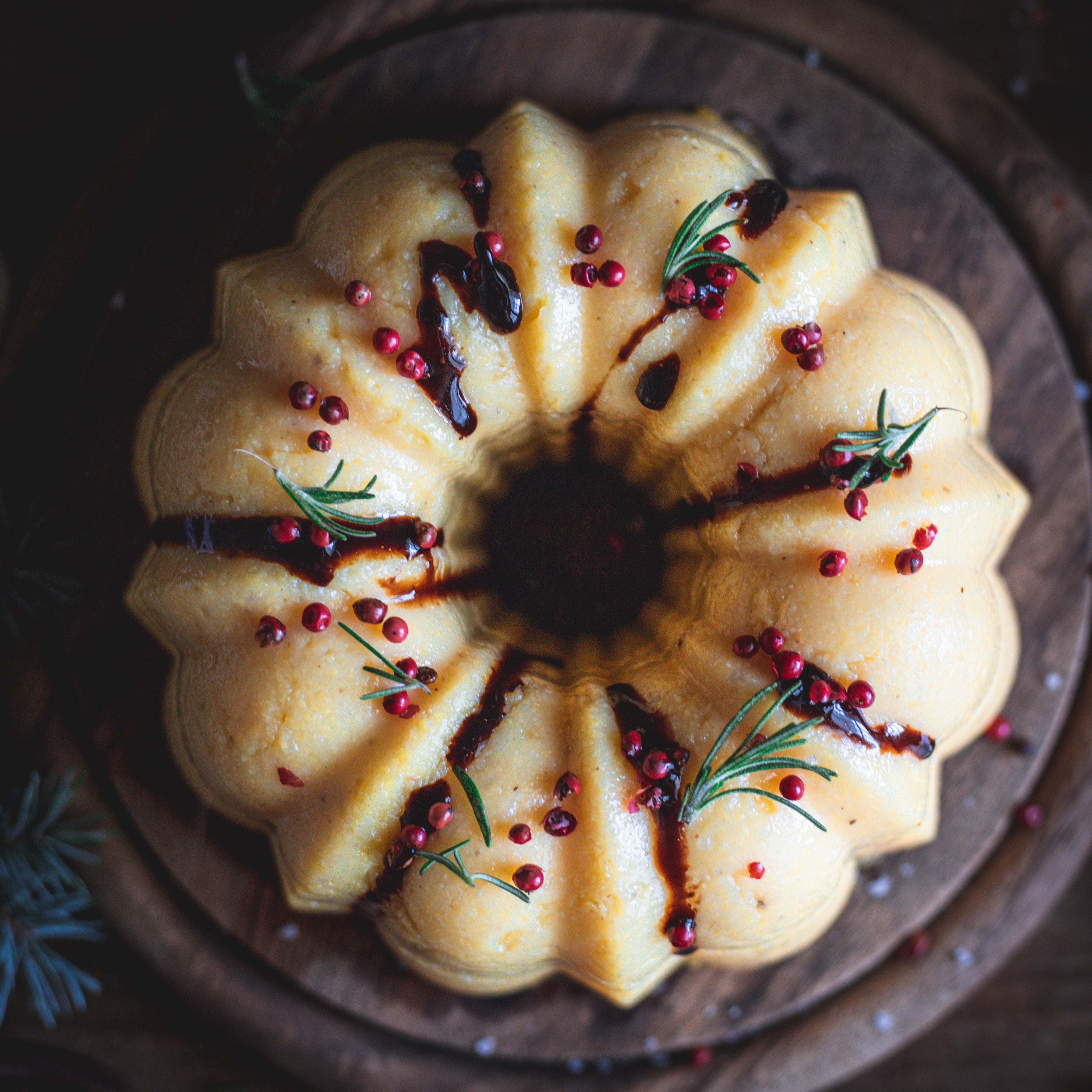 Alles gut verrühren und 2/3 der Polenta in eine mit Ölausgepinselte Kranzform (1,5 l) füllen.