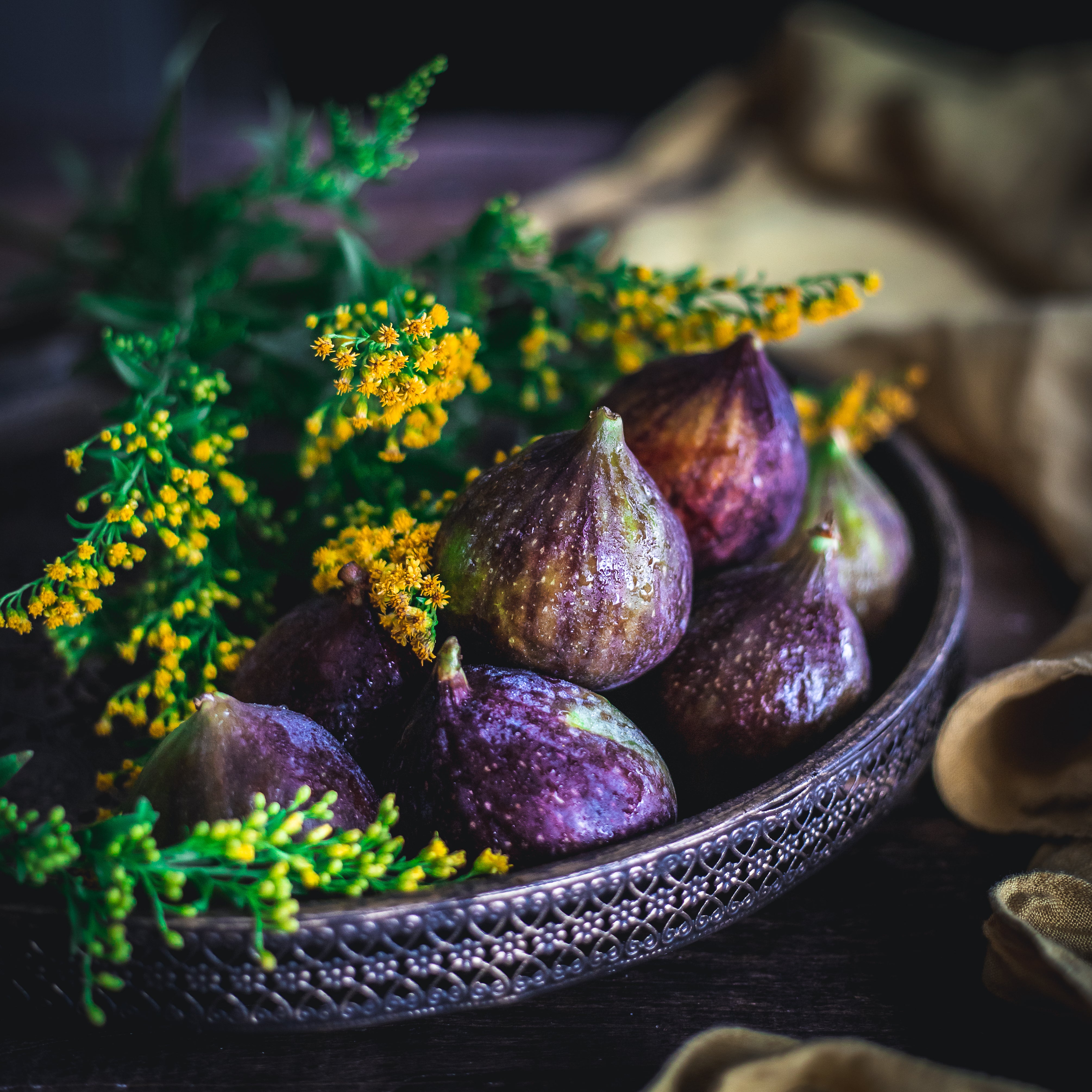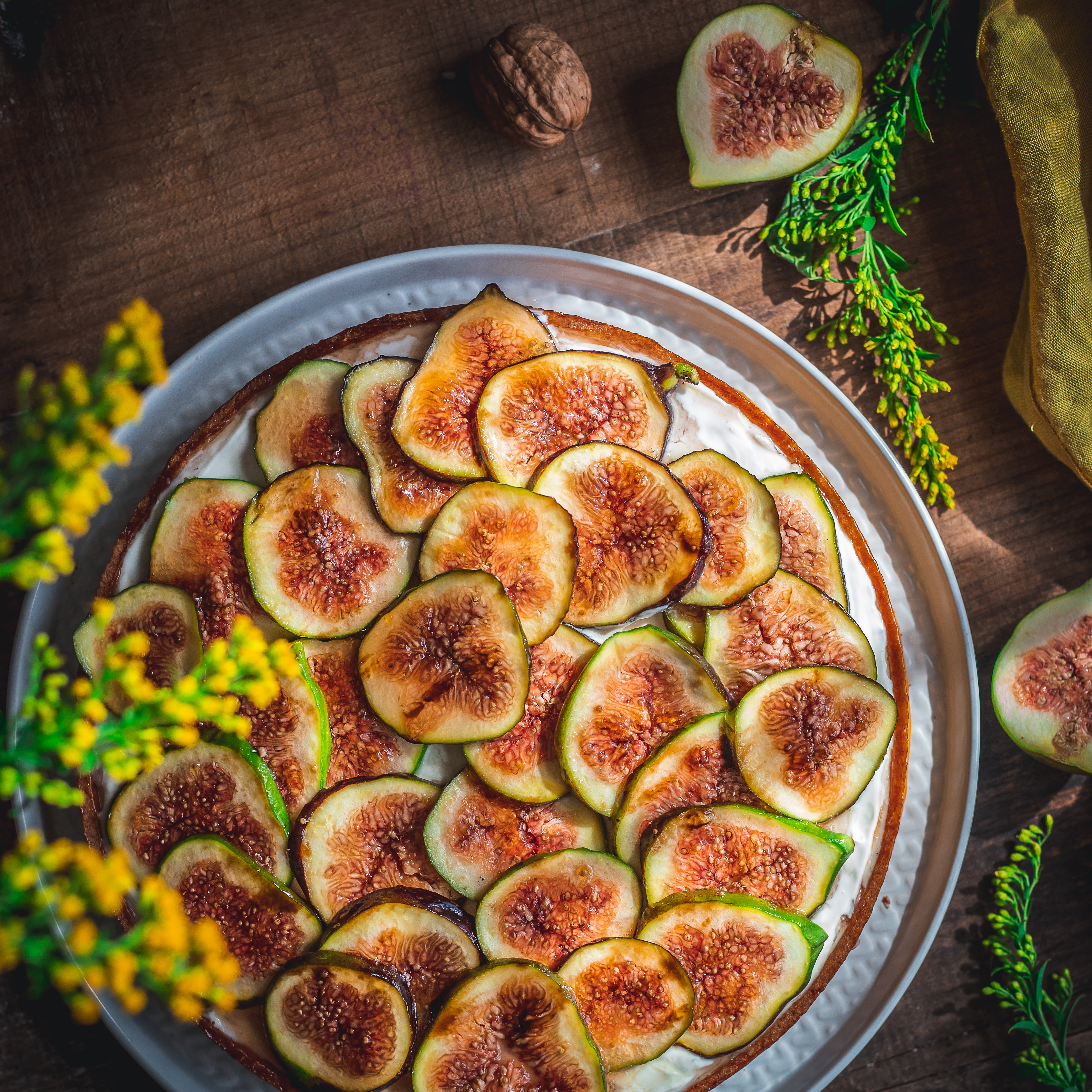 Découper les figues en fines tranches. Chauffer légèrement le miel et ajouter quelques cuillères à café de condiment à base de vinaigre balsamique et figues. Mélanger. Étaler la confiture de figues sur le fond de la tarte, verser la crème jusqu'au bord. Disposer les tranches de figues en surface. Badigeonner avec la sauce au miel tiède. À discrétion, ajouter quelques noisettes grillées.