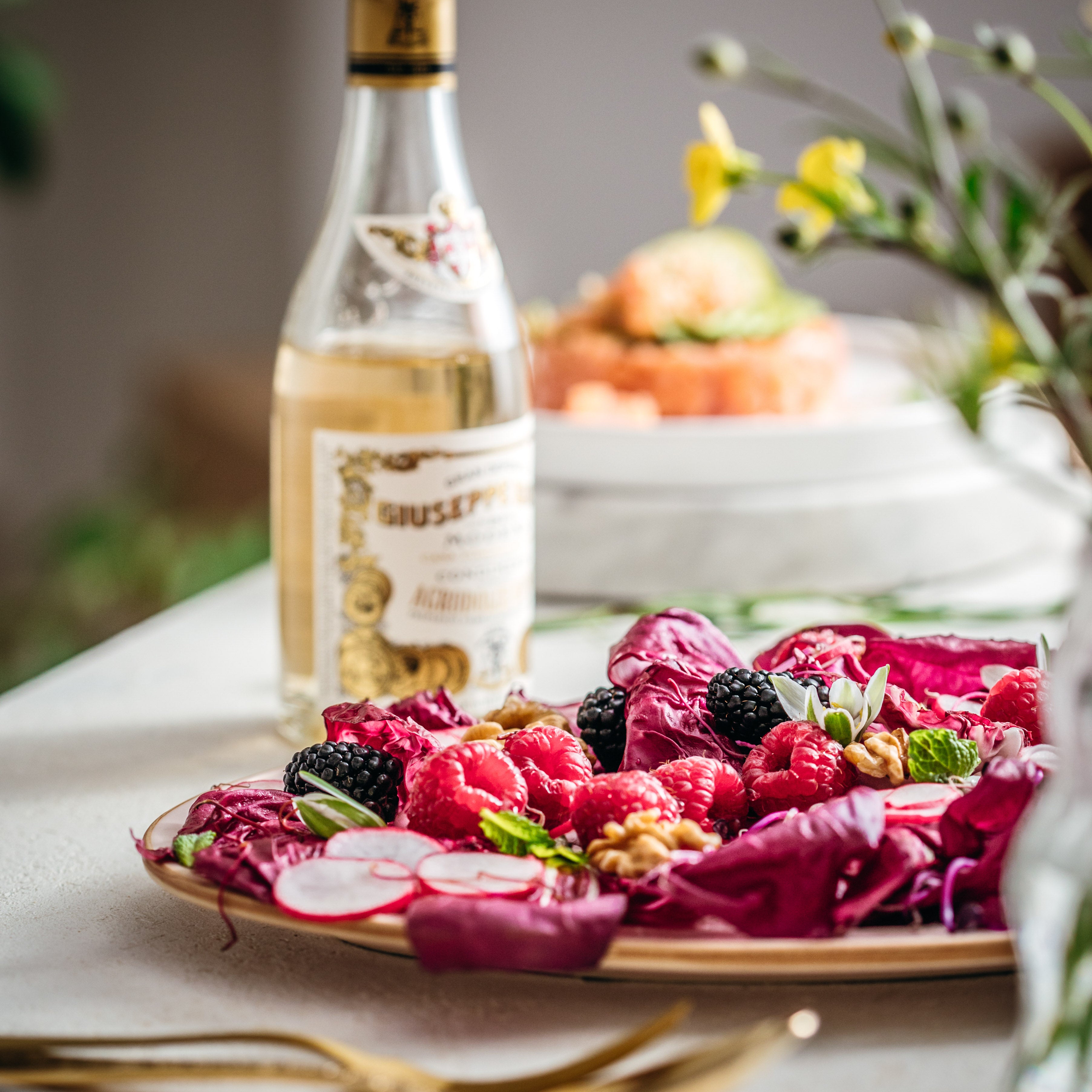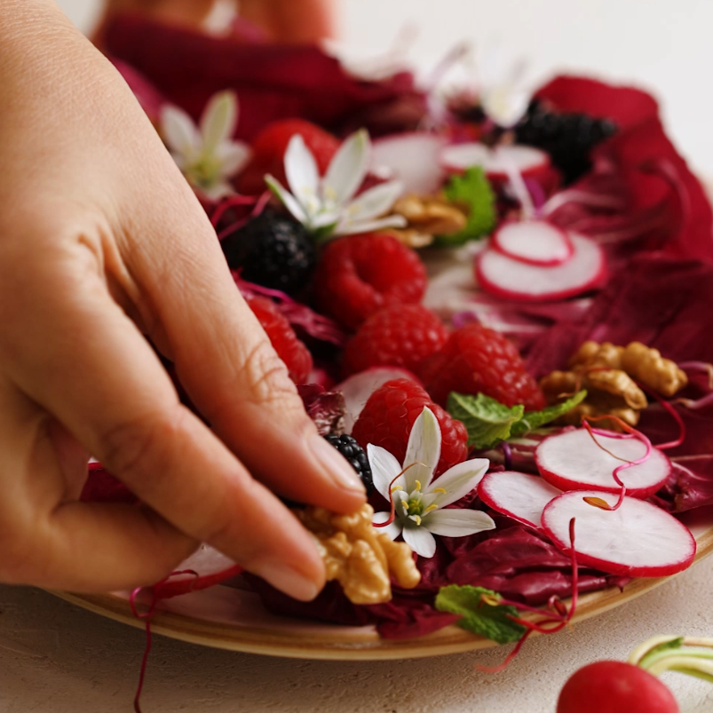 Disposez les feuilles de radicchio sur un plat de service. Répartissez les framboises, les mûres et les rondelles de radis. Ajoutez les noix grossièrement concassées et quelques feuilles de menthe pour une note aromatique.