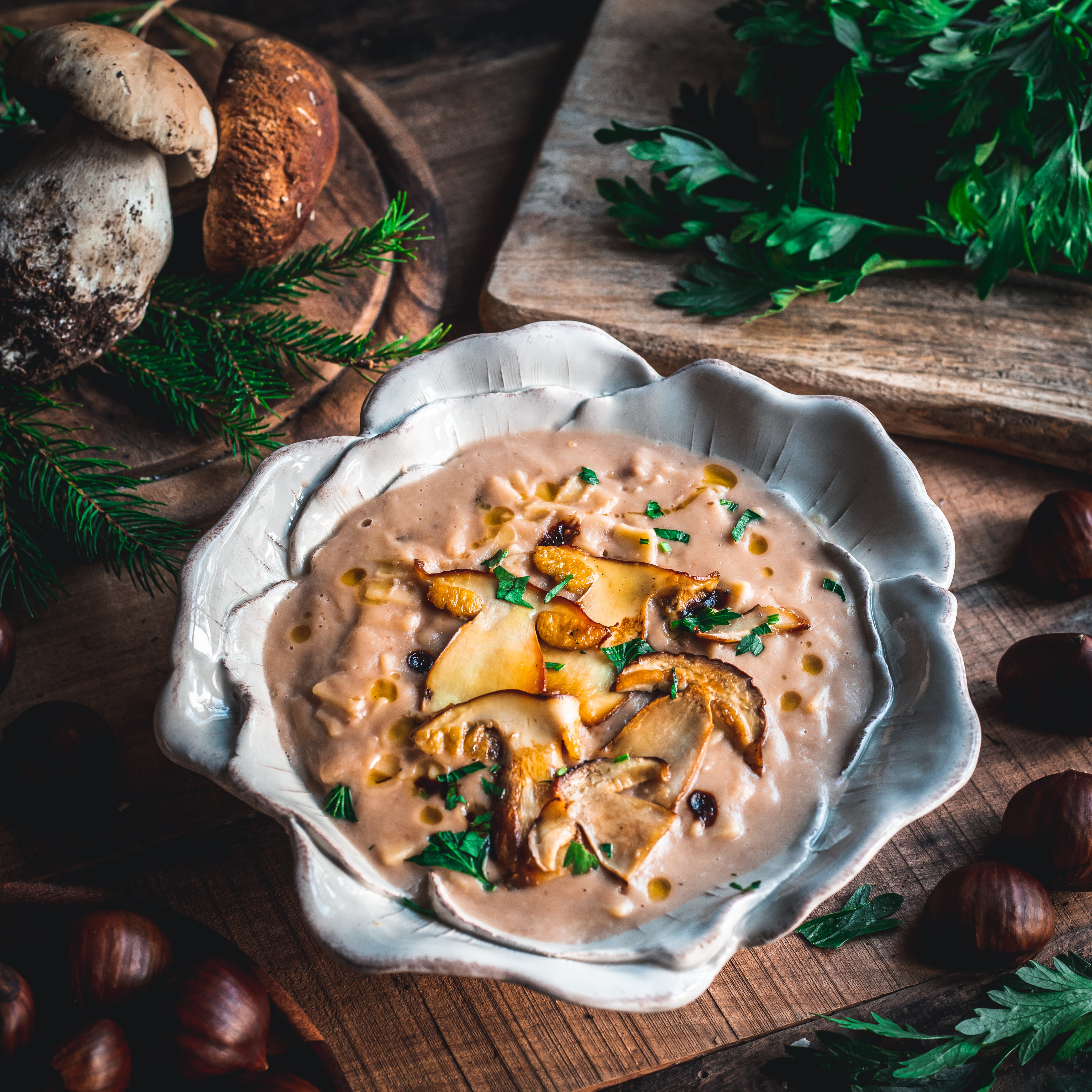 Mescolare brevemente il tutto, versare nelle fondine e decorare con qualche fetta di porcino, un filo d’olio, del prezzemolo tritato ed alcune gocce di Aceto Balsamico Tradizionale Affinato.