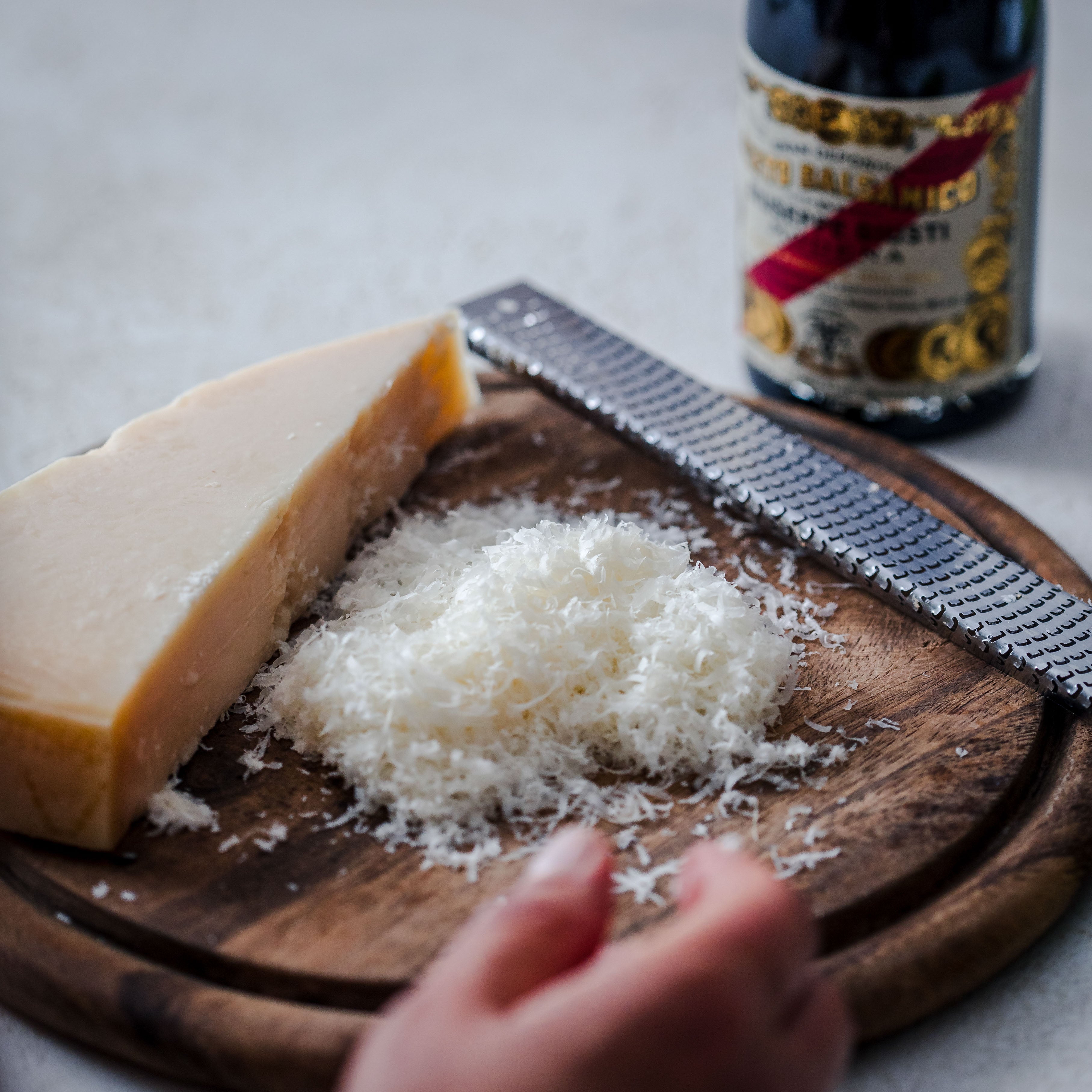 Verso fine cottura aggiungete il burro, il Parmigiano e un mestolino di brodo. Mantecate bene il tutto e versate nei piatti. Conditelo con gocce di Balsamico di Modena Giusti 5 Medaglie d’oro.